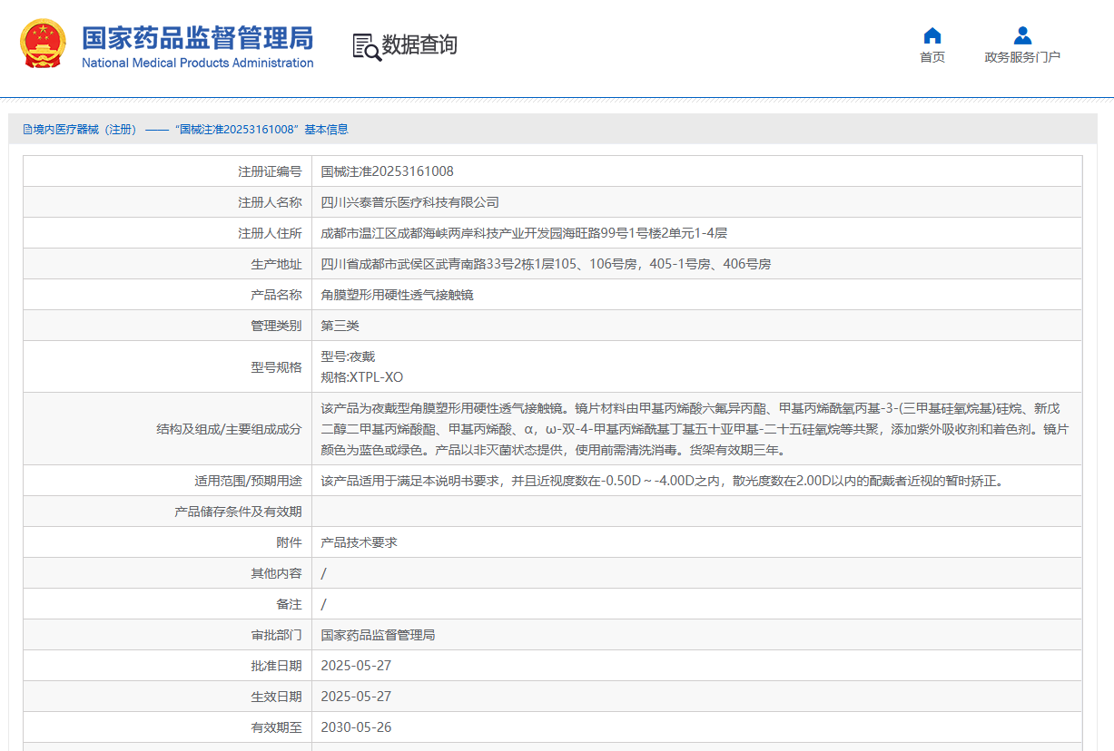 奧泰康助力興泰普樂「角膜塑形用硬性透氣接觸鏡」獲批上市2025年5月27日,經(jīng)國家藥品監(jiān)督管理局公示,四川興泰普樂醫(yī)療科技有限公司的角膜塑形用硬性透氣接觸鏡(國械注準20253161008)獲得NMPA批準上市,奧泰康負責本項目臨床試驗工作。